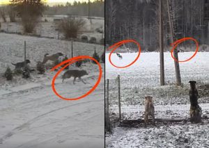 Vilkui šuo yra tarsi saldainis. Nufilmuota, kaip Latvijoje dienos metu keturi vilkai apsupa sodybos šunis.