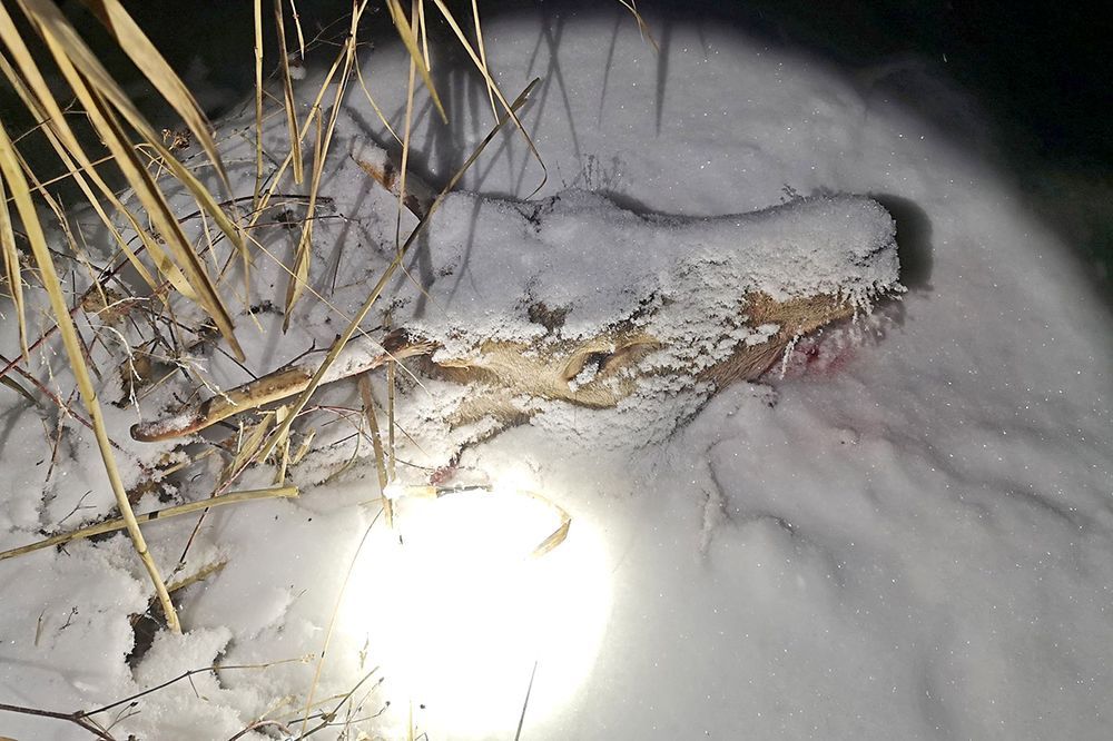 Tą pačią naktį pavyko surasti vietą, kur brakonieriai įvykdė kruviną išpuolį prieš elnius. Čia pat rasta ir nupjauta elnio, kurį sumedžioti neturėta teisės, galva – spėjama, kad laukuose ji palikta, siekiant nuslėpti įkalčius.