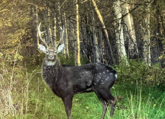 Gamtos gidas ir medžiotojas Peteris Husaras paaiškina, kad dėmėtąjį elnią nesunku atskirti nuo tauriojo elnio. „Jo ragai mažesni, o ant kūno matyti balti taškeliai. Šis buvo suaugęs, gerai išsivystęs patinas.“
