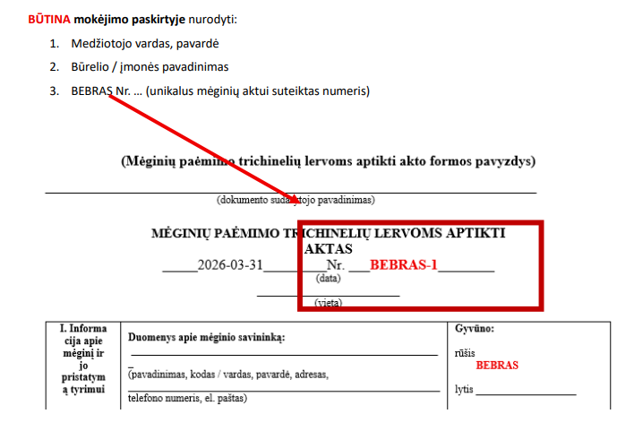 Lydimasis dokumentas pildomas taip pat, kaip ir siunčiant šernų mėginius trichineliozės tyrimui, tačiau eilutėje „Gyvūno rūšis“ turi būti paryškintai įrašyta „BEBRAS“.