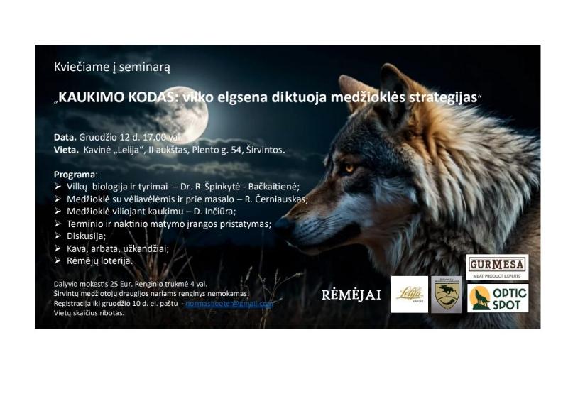 Būtent dėl šių pokyčių patyręs medžiotojas Ričardas Černiauskas nusprendė surengti specialų seminarą visiems, kurių veikla bent iš dalies susijusi su vilkais ir jų populiacijos valdymu. Gruodžio 12 dieną kavinėje Lelija Širvintose vyks renginys Kaukimo kodas kurio tikslas pristatyti naujausią informaciją apie vilkų biologiją, elgseną ir praktinius sprendimus, aktualius medžioklėje.