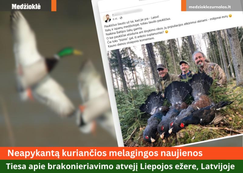 Neteisėtą vandens paukščių medžioklę Liepojos ežero gamtos rezervate aptiko Aplinkos apsaugos departamento (DAP) inspektorius. Patikrinimo metu nustatyta, kad vienas iš medžiotojų naudojo pusiau automatinį ginklą, kurį galima užtaisyti daugiau nei trimis šoviniais, o tai draudžiama medžiojant vandens paukščius.