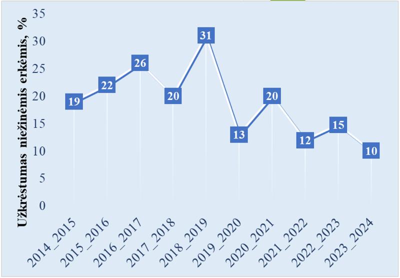 Mažiausias užsikrėtimo lygis nustatytas praėjusį medžioklės sezoną, o didžiausias – 2018–2019 metų sezonu. Kaimyninėje Latvijoje šiuo metu nustatytas vilkų užsikrėtimo niežais lygis taip pat siekia apie 10 procentų.