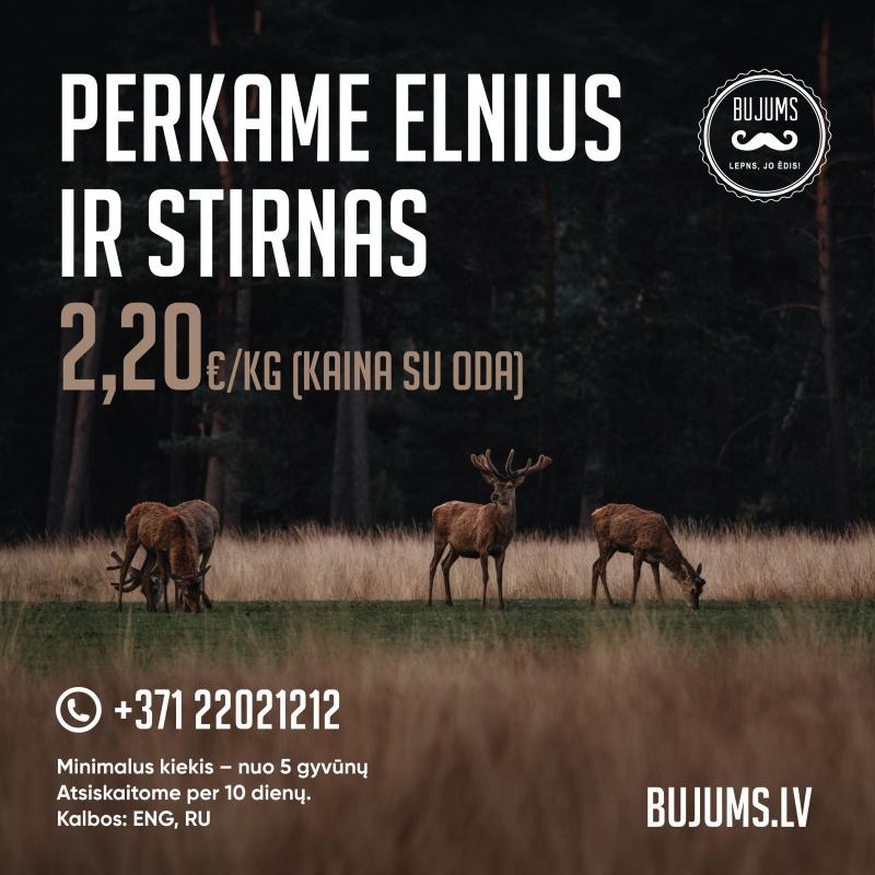 Artėjant varyminės medžioklės sezonui ir tęsiantis tauriųjų elnių bei briedžių patinų medžioklei, Latvijos įmonė Bujums siūlo supirkti sumedžiotų žvėrių skerdenas. Lietuvos medžiotojams ši bendrovė suteikia galimybę priduoti tauriųjų elnių ir stirnų skerdenas, siūlydama konkurencingas kainas bei aukšto lygio aptarnavimą.