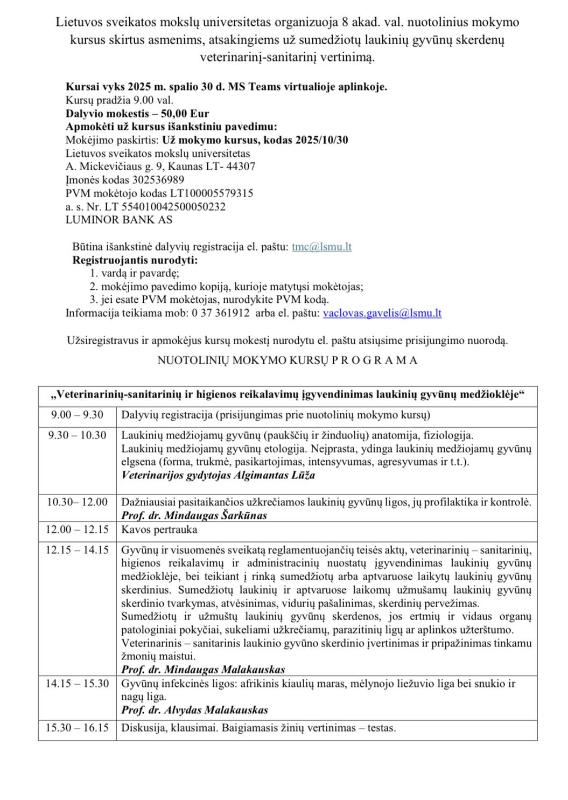 Lietuvos sveikatos mokslų universitetas (LSMU) spalio 30 d. organizuoja aštuonių akademinių valandų nuotolinius mokymus, skirtus asmenims, atsakingiems už sumedžiotų laukinių gyvūnų skerdenų veterinarinį ir sanitarinį vertinimą. Šie mokymai – būtina sąlyga visiems medžiotojams ar medžioklės kolektyvams, norintiems tiekti sumedžiotų gyvūnų mėsą tiesiogiai vartotojui ar prekybai.