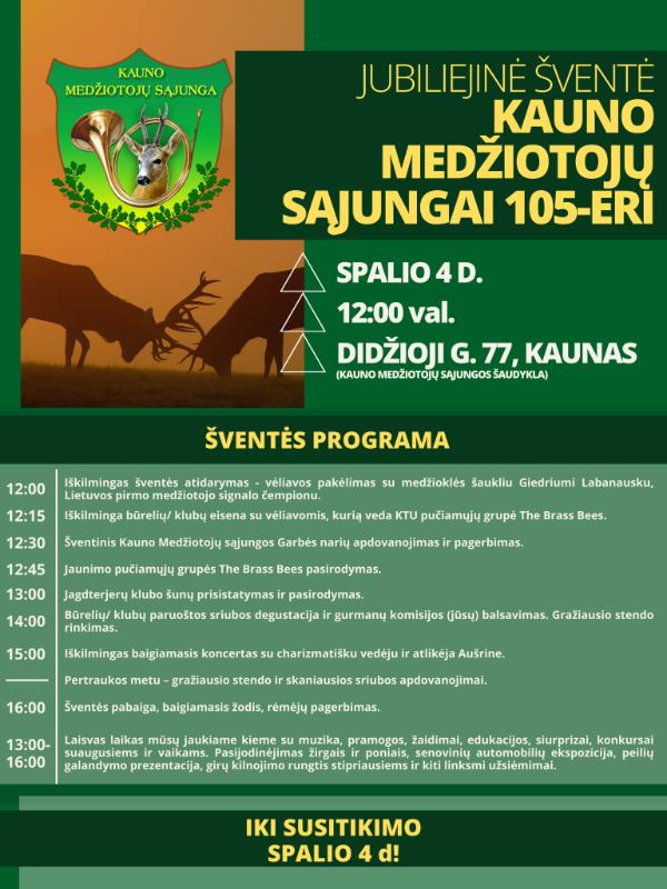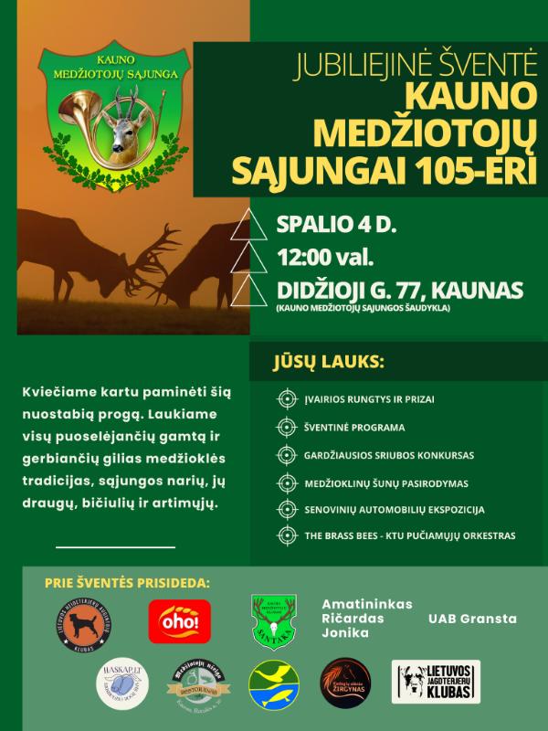 Kai medžiotojų pasaulyje minimi metai, prabėgę kartu su bendruomene, tai nėra tik skaičiai. Tai pasakojimai apie žmonių aistrą, tradicijų tęstinumą ir meilę gamtai, kuri palaiko gyvybę bendruomenėje. 2025 m. spalio 4 d. Kauno medžiotojų sąjunga minės savo 105-ąją sukaktį – jubiliejų, žymintį šimtmetį trunkantį kelią nuo ankstyvųjų idėjų iki šiuolaikinės organizacijos stiprybės.