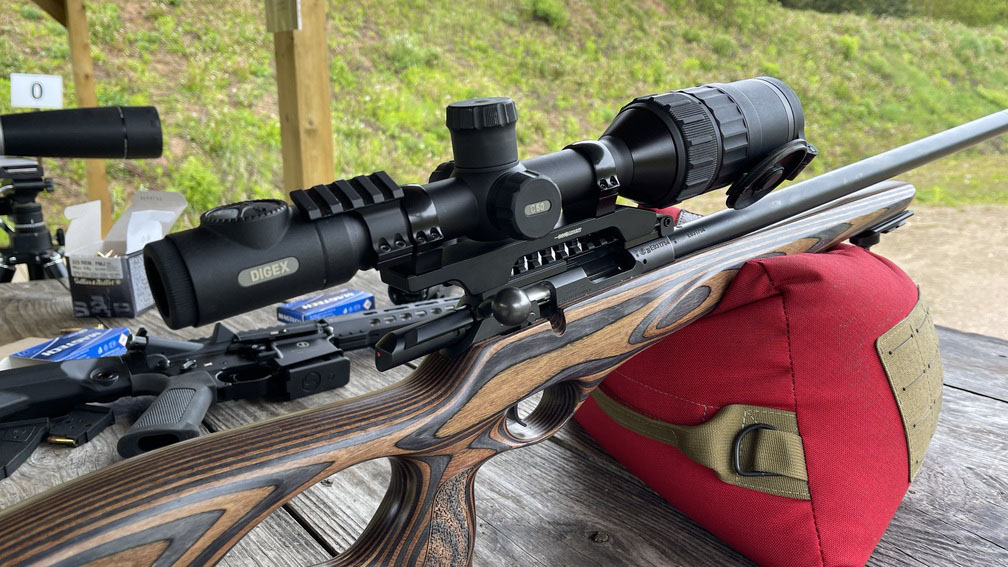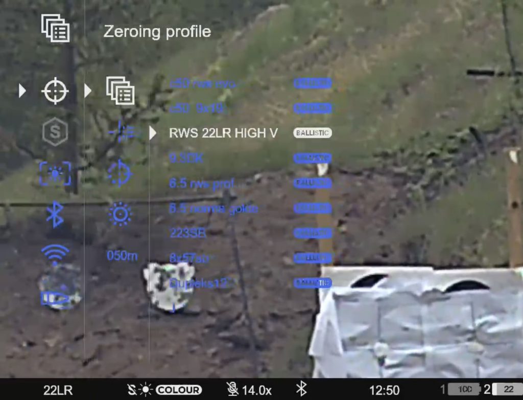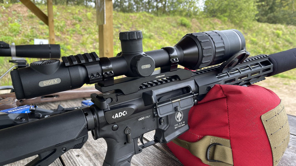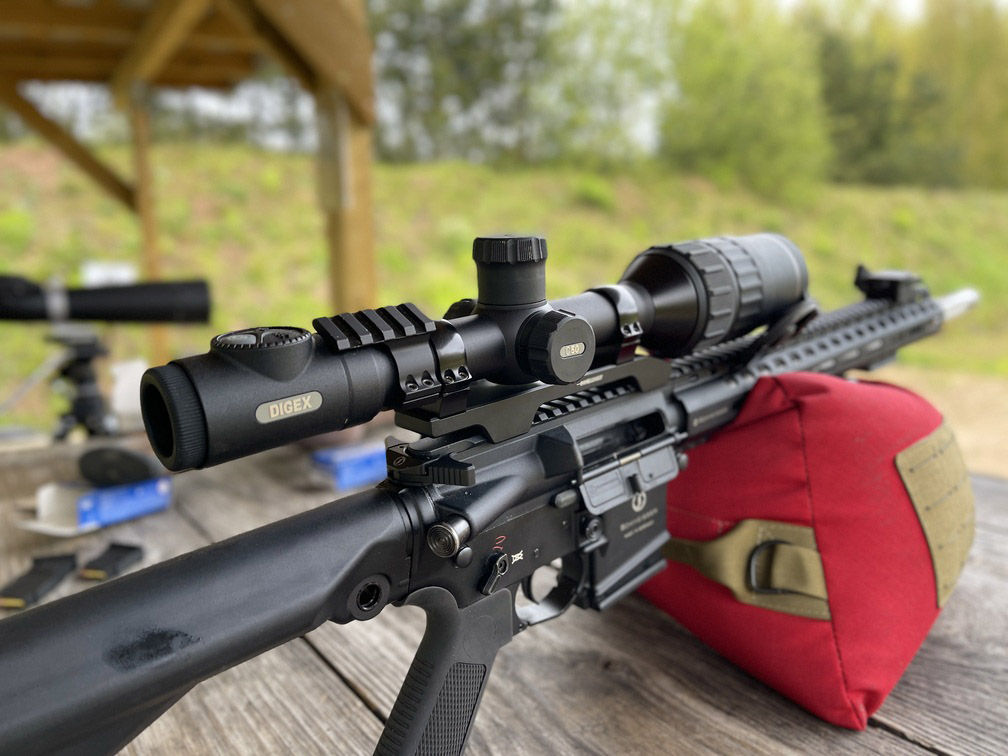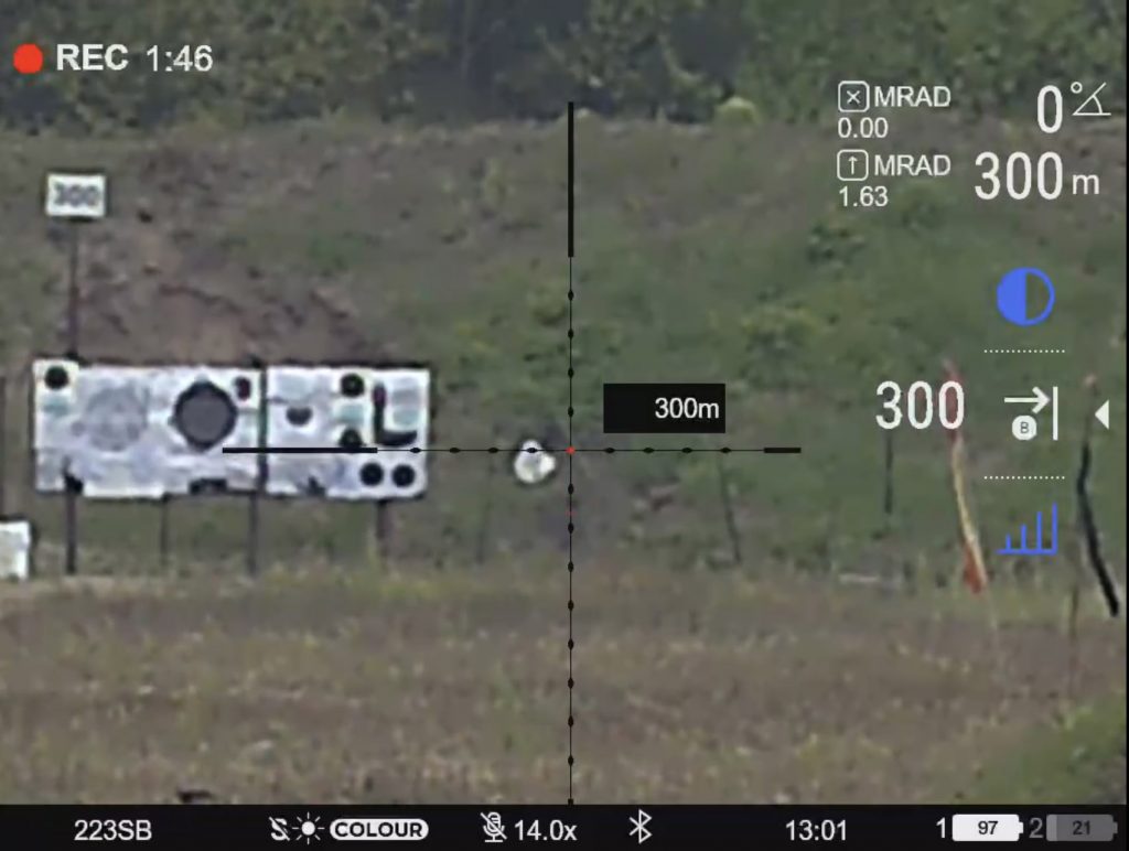 Digex taikiklis jau yra prišaudytas visiems trims ginklams 50 metrų atstumu – taikiklio nustatymuose kiekvienam iš jų suteiktas savas koordinatės profilis. Dabar reikia įjungti .22 LR profilį, pakeisti šaudymo atstumą į norimą – šįkart 100 metrų. Iš anksto nustatytas balistinis skaičiuotuvas apskaičiuoja pataisą, pažymi ją taikymo tinklelyje ir ginklas paruoštas šūviui. Nors atstumo skirtumas neatrodo didelis, šiam mažo kalibro ginklui taikymo pataisa yra gana ryški. Galiausiai – jokių problemų pataikyti į mažą taikinį (gongą).