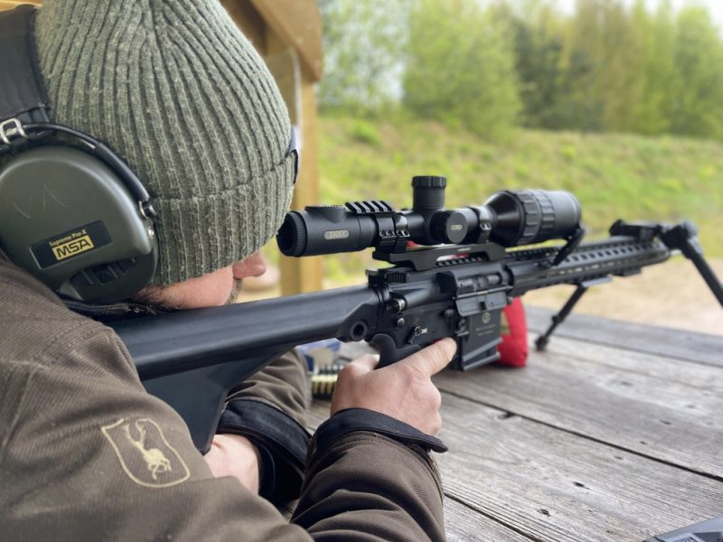 Kadangi lijo lietus, visa aplinka buvo šlapia ir nepalanki termoviziniam vaizdui, todėl šįkart bandymui naudojome seną gerą Pulsar Digex C50 – skaitmeninį taikiklį, kuris jau pasitraukė iš parduotuvių lentynų, tačiau vis dar sėkmingai naudojamas daugelio medžiotojų. Ant šaudyklos stalo stovėjo trys ginklai – klasikinio medžioklės stiliaus karabinas .22 Long Rifle kalibro ir dar du taktiniai karabinai – 9×19 mm Parabellum ir .223 Remington. Visi jie turi Picatinny bėgelį, todėl jiems tinka vieno tipo Innomount laikiklis.
