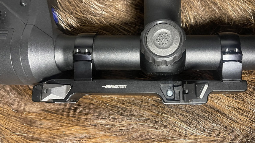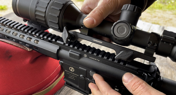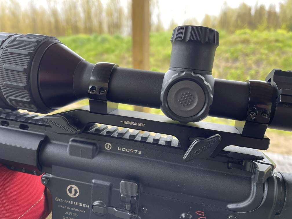 Pirmasis į startą stoja .22 Long Rifle. Laikiklio tvirtinimas prie Picatinny bėgelio panašus – jis turi būti užkabinamas iš šono ir užfiksuojamas. Skirtumas tik tas, kad šis laikiklis, skirtingai nei tas, kurį naudojau Tikka ginklui, turi dinamometrines fiksavimo svirtis. Jos leidžia taikiklį prispausti tiksliai ir vienodu stiprumu, net jei bėgelio išpjovų matmenyse yra nedidelių skirtumų.